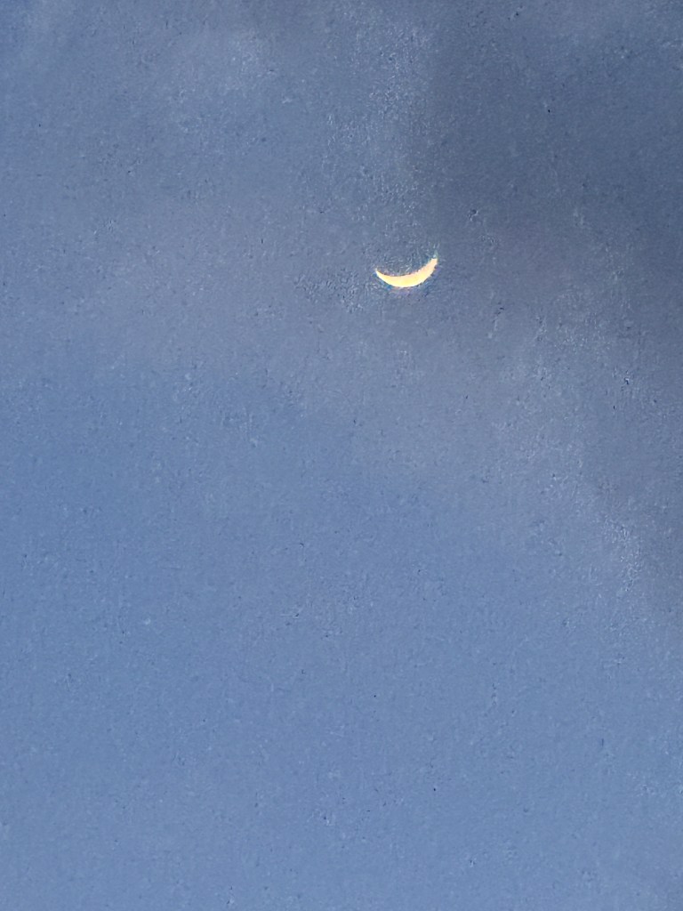 10:11 a.m. Last night I laid in my hammock looking up at the sky while the sun set. As it got dark I could see the shiny silver crescent moon, partially cloaked by clouds. It was beautiful.