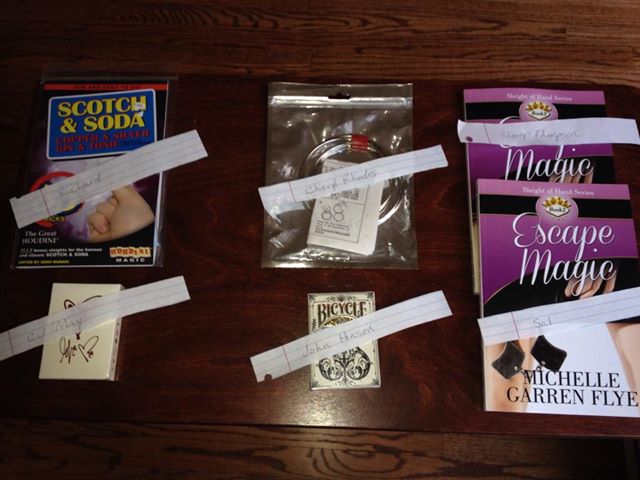 Winners! Richard, Scotch & Soda; Cheryl Rhodes, Linking Rings; C.J. May, Love Me deck; John Hinson, Archangel deck; Sherry Thompson, Escape Magic; Sal, Escape Magic.
