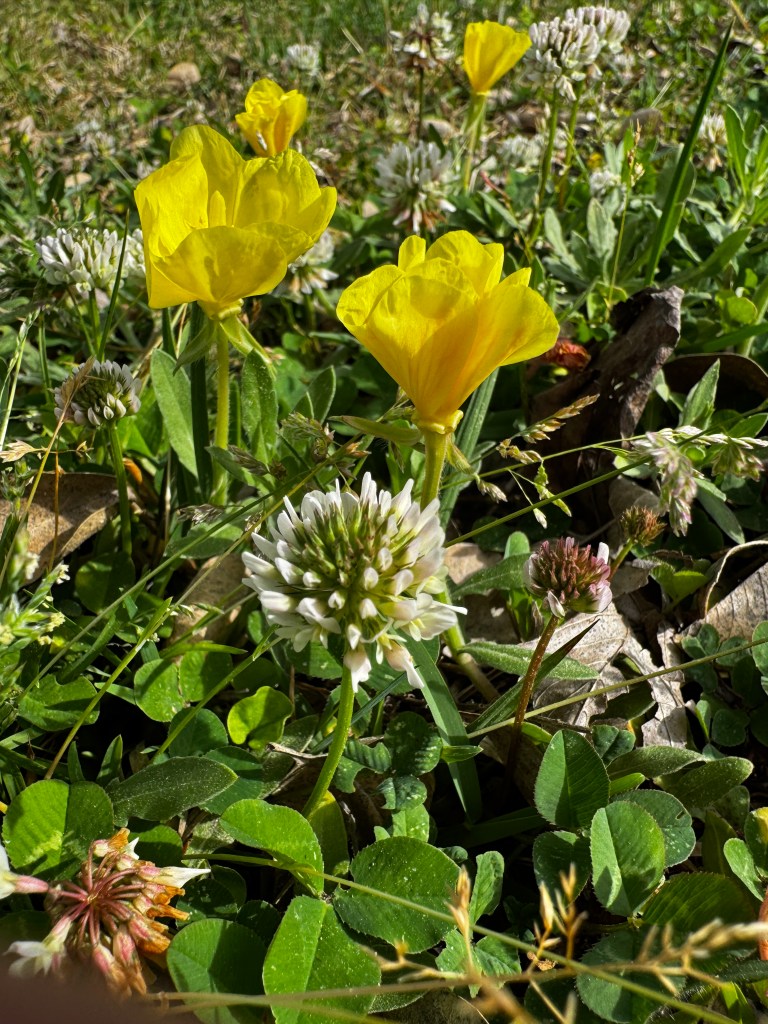 But look, sprinkled in, the yellow and pink blooms well loved by butterfly and bee. They stop awhile to get a quick drink; it’d be a shame to deny them their glee.