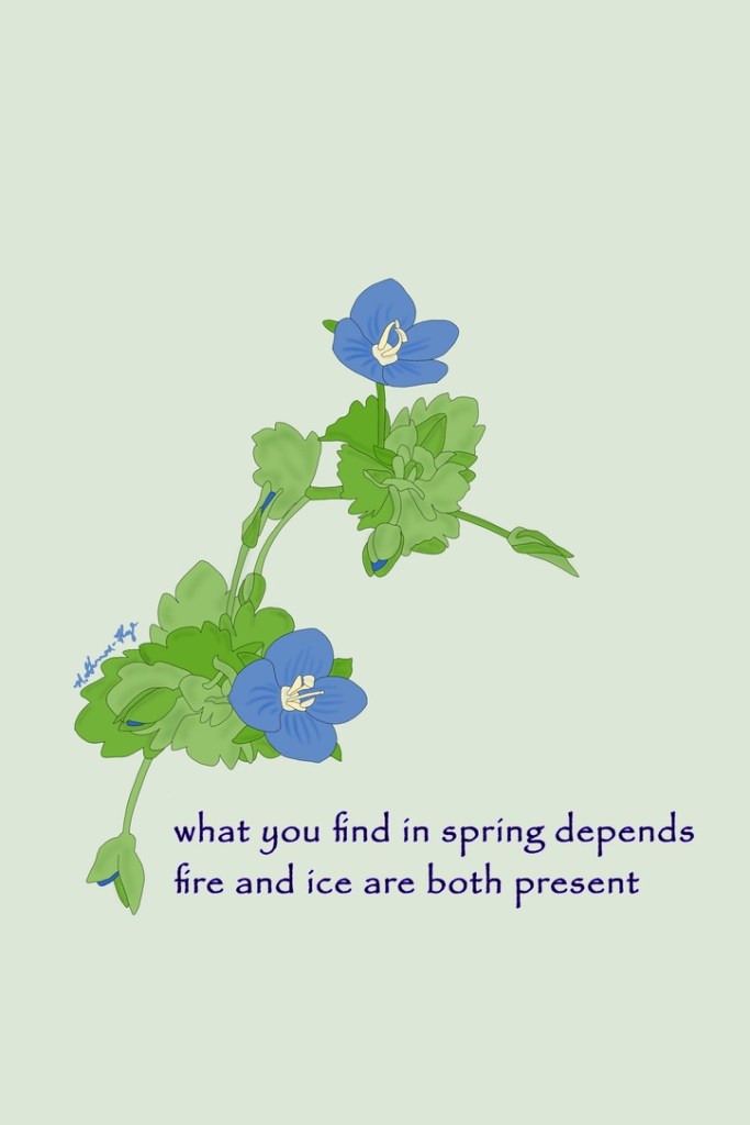Most of my illustrations for this renga come from photos I shot on my iPhone while walking my dog. Very few of them were actually in focus lol. Which makes this new word of mine all the more pertinent. When I turn the pictures into illustrations, it’s like I’m improving the focus. Like this one.